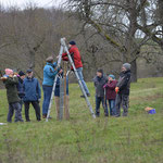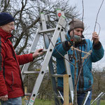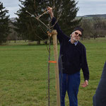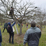Nach der Mittagspause konnte die Theorie in drei Gruppen unter der Leitung von C. Nadler, R. Scheibel und K. Spieler in die Praxis umgesetzt werden. Ein Schwerpunkt war der Pflanzschnitt, der auf Grundstücken von letztjährigen Baumbestellern geübt wurde. Anschließend wurden auch ältere Bäume geschnitten. Den „Neulingen“ konnte damit eine wertvolle Starthilfe gegeben werden.