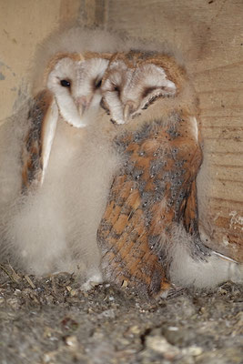 Bei den Schleiereulen verlief das Brutgeschäft sehr wechselhaft. Anfang April waren zwei Schleiereulenküken frisch geschlüpft und auf vier Eiern wurde noch gebrütet. Aus einem schlüpfte ein Junges, das leider nicht überlebte. Die übrigen Eier verschwanden, entweder von den Dohlen geklaut oder die geschlüpften Jungen wurden von ihren Eltern an den schon vorhandenen Nachwuchs verfüttert; Eischalenreste haben wir allerdings nicht gefunden. Die Schleiereulen-Eltern hatten es nicht leicht, zu ihren Jungen in die hinterste Ecke des Nistkastens zu gelangen. Im engen Zugangstunnel hatten sich anfangs Dohlen breit gemacht, später wollten Tauben dort ihr Nest bauen. Unser Foto zeigt die beiden verbliebenen Jungeulen mit bereits deutlich ausgebildetem Gefieder. Bei unserer letzten Inspektion lagen sie tot im Nistkasten. Vermutlich sind sie verhungert, weil die Alten nicht mehr kamen. Die Hoffnung ruht nun auf einer zweiten Brut. Fraglich ist, ob sie überhaupt stattfindet, denn über den Verbleib der Alteulen wissen wir nichts – ein neues Paar wird wohl mitten in der Brutsaison nicht in den Nistkasten einziehen.