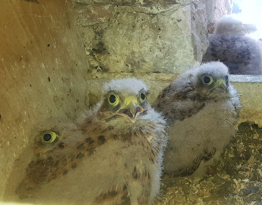 Mitte April begann das Turmfalkenweibchen mit dem Eierlegen, Anfang Mai war das Gelege mit sechs Eiern komplett. Das Brüten verlief glatt – sechs Küken schlüpften. Das Foto zeigt vier der sechs wohlgenährten Nesthocker ungefähr zwei Wochen vor ihrem ersten Ausflug. In dieser Wuchsphase konnten wir es nicht mehr wagen, den Nistkasten zu öffnen. Die Gefahr, dass die Jungvögel in den Kirchturm gelangen oder nach außen flüchten und abstürzen würden, war zu groß. Ab diesem Zeitpunkt beobachteten wir vom Kirchplatz oder Kirchgässchen aus, wie die Jungfalken das Nest verließen und sich auf der Ansitzstange oder auf dem First des Kirchenschiffs von den Alten füttern ließen. Jetzt Ende Juni werden die Jungvögel selbstständig und können sich noch bis zur kalten Jahreszeit Speck durch erbeutete Mäuse anfressen, von denen gibt es in diesem Jahr mehr als genug.