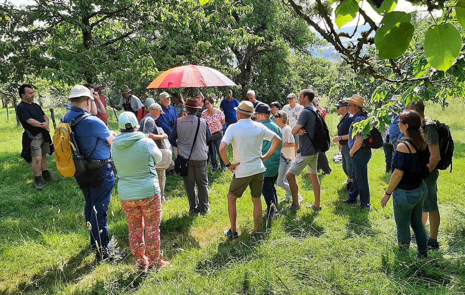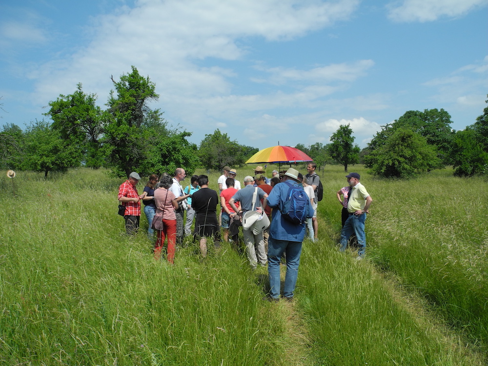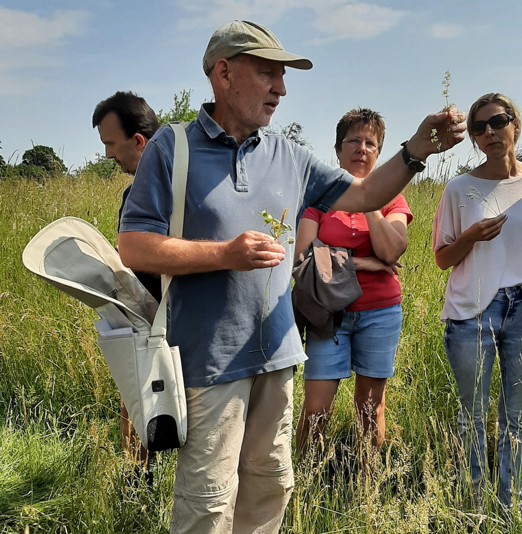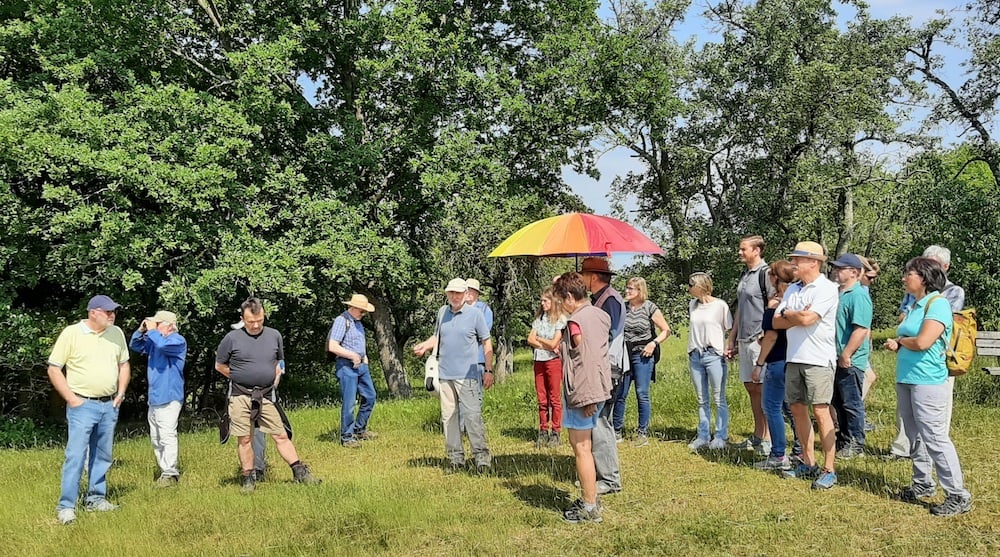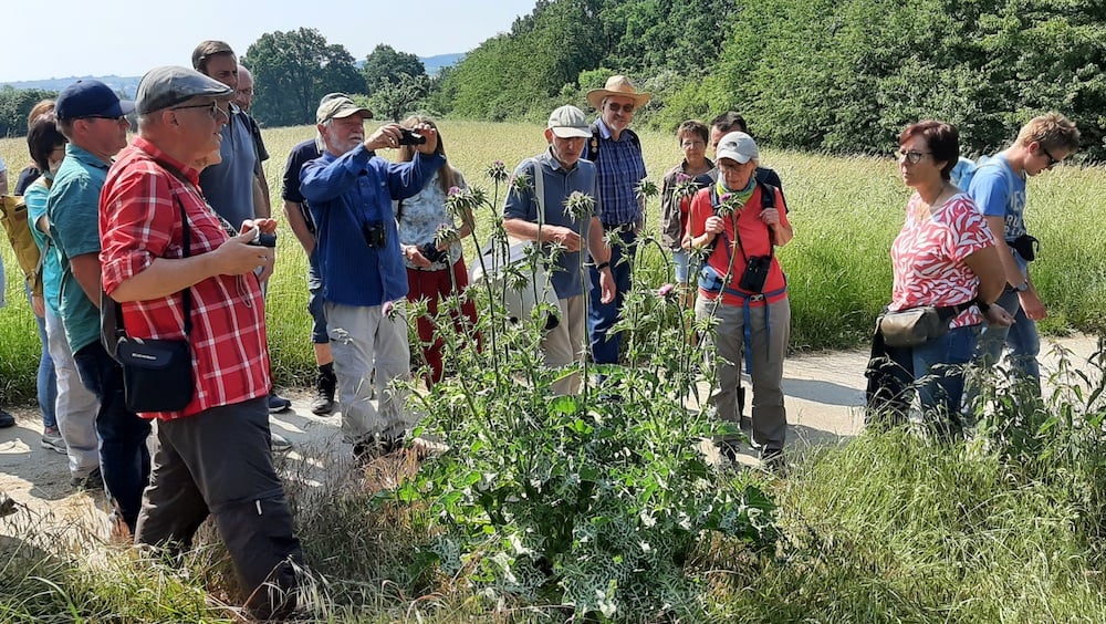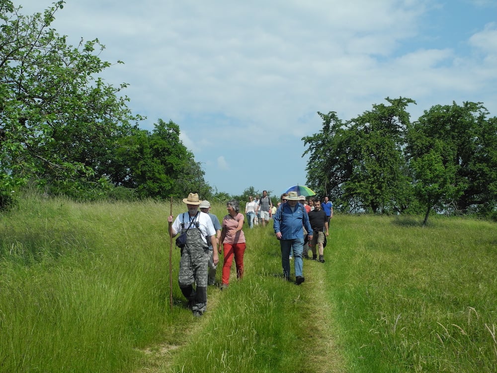 Zum Beweis der Vielfalt an Arten ließ der seltene Wendehals, eine Spechtart, seinen nasalen Ruf ertönen; neben einer Vielzahl weiterer Vögel wie dem Gartenrotschwanz, der Mönchsgrasmücke und dem Grünspecht konnte man die Goldammer ihr unverkennbares Lied singen hören. Auch auf ins Auge fallende Wiesenblumen, die früher weit verbreitet waren und heute fast nur noch im Schutzgebiet vorkommen, wie Margerite, Schafgarbe, Hornklee und Wiesensalbei, ging Möbs ein und erläuterte deren besondere Inhaltsstoffe und Standortanforderungen. Die Tricks des kleinen Klappertopfs, der als Halbschmarotzer die Wurzeln von Gräsern anzapft und sich dadurch Standortvorteile gegenüber höher wachsenden Pflanzen verschafft, erstaunte die Zuhörer ebenso wie die Strategie des Kleinschmetterlings Widderchen in Zusammenarbeit mit seiner Wirtspflanze, dem Hornklee.