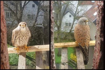 Auch bei den Falken sieht es gut aus. Fünf Eier bebrütet das Paar. Während die Schleiereulen bei der geringsten Störung aus dem Nistkasten flüchten, sind die Falken nicht so ängstlich. Trotzdem gilt es, Geräusche und Erschütterungen zu vermeiden. Ganz leise und vorsichtig waren die NABU-Betreuer an den Falkenkasten herangetreten und haben dann durch das über dem Nistkasten angebrachte Fenster nacheinander die schönen Vögel auf der Ansitzstange ablichten können (siehe Foto, Weibchen links, Männchen rechts).