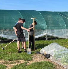 Die Sitzstangen auf der Fläche der SoLaWi Treibgut stehen. Sie sind wichtig, da der Mäusebussard einen großen Appetit auf Mäuse hat, aber auf einen erhöhten Ansitz angewiesen ist. Sie mussten vor der Gruppenstunde erst noch zusammengebaut werden. Florian Weil hat uns über das Gelände geführt und es gab ein Gemüsetasting. Nachdem die Sitzstangen aufgestellt waren, wurden wir von Caro mit Kuchen und Getränken verpflegt. Dabei gab es einen kleinen Exkurs in die Anbauweise der SoLaWi und deren effiziente und schonende Arbeitsweise.